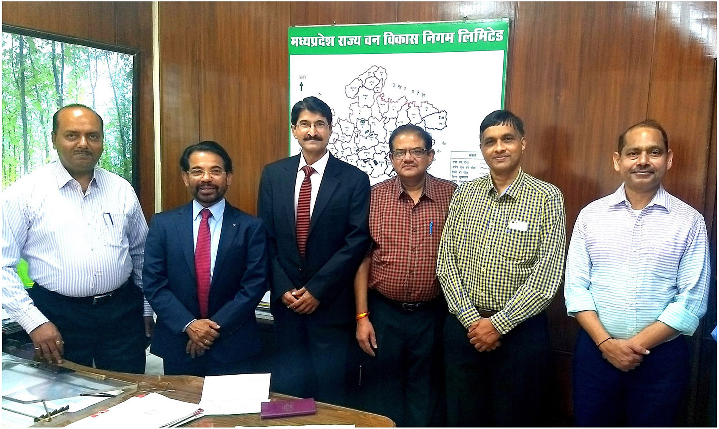From Left: Mr. Ravi Srivastava, MD, MP Forest Development Corporation and PCCF, Madhya Pradesh, Mr. VG Nair, CEO, Sami Labs, Dr. Arvind Saklani, VP, Agri Biotechnology, Sami Labs, Mr. B.P.S. Parihar, Regional Chief General Manager, Mr. Atul Jain, Additional PCCF and AMD, Mr. Bharat Sharma, Regional Chief General Manager, MP Forest Development Corporation.